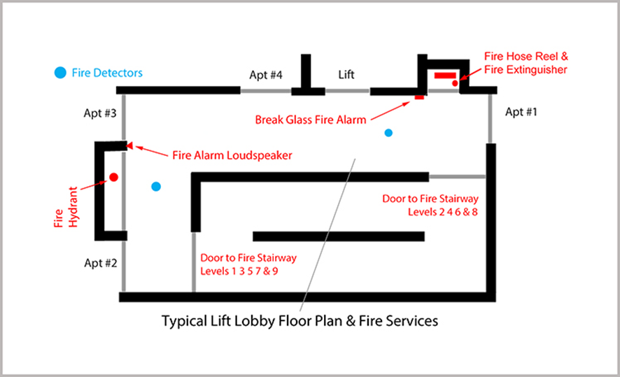 The fire services available in the lift lobbies of levels 1 to 9 are shown on the plan below, they are: